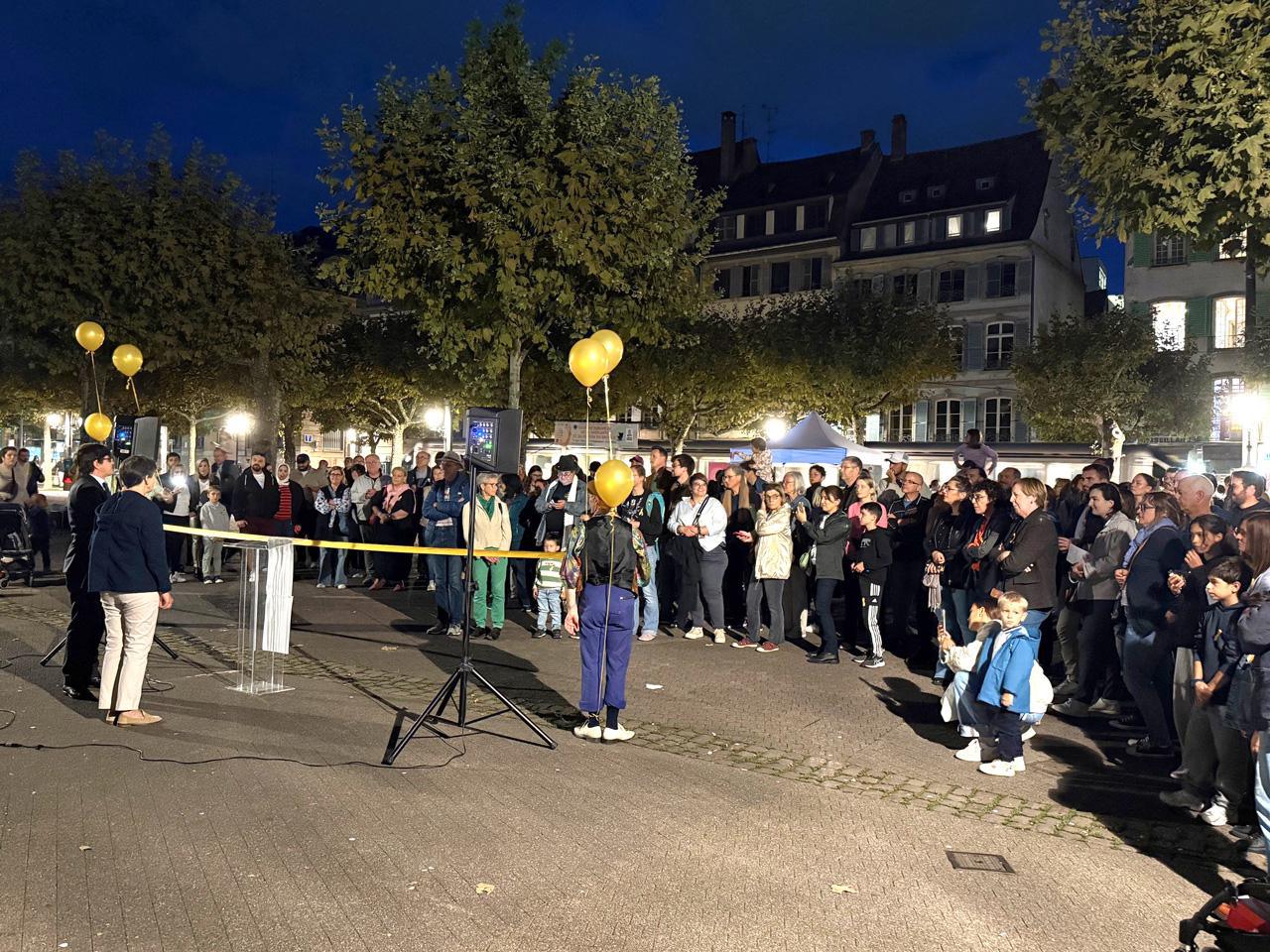 Le service d’onco-hématologie pédiatrique dirigé par le Pr Catherine Paillard a été mis à l’honneur Place Broglie samedi 13 septembre. Les bâtiments de la mairie et de l’Opéra national du Rhin se sont parés d’or pour mettre en lumière l’action des soignants, en présence de Samir Henni, le directeur général des Hôpitaux Universitaires de Strasbourg.