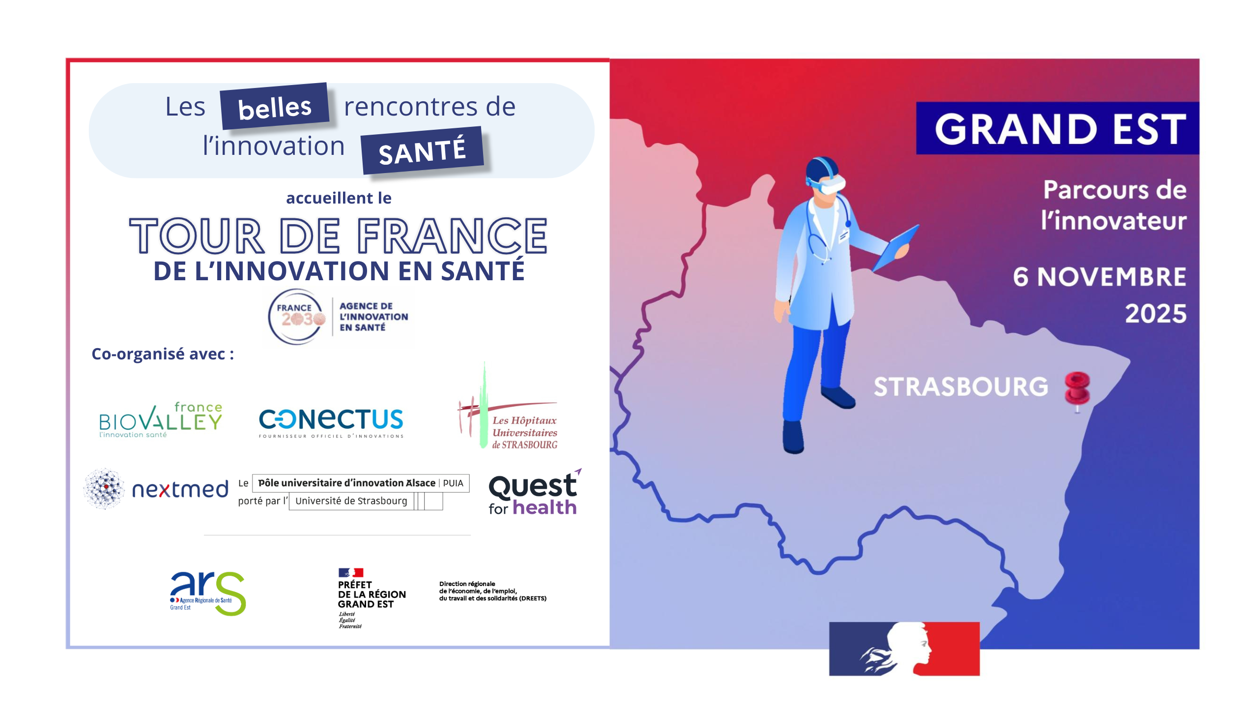 Cette étape est coorganisée avec Biovalley France, Conectus, les Hôpitaux Universitaires de Strasbourg, Nextmed, le Pôle universitaire d’innovation d’Alsace, l'ARS Grand Est et la Dreets Grand Est.