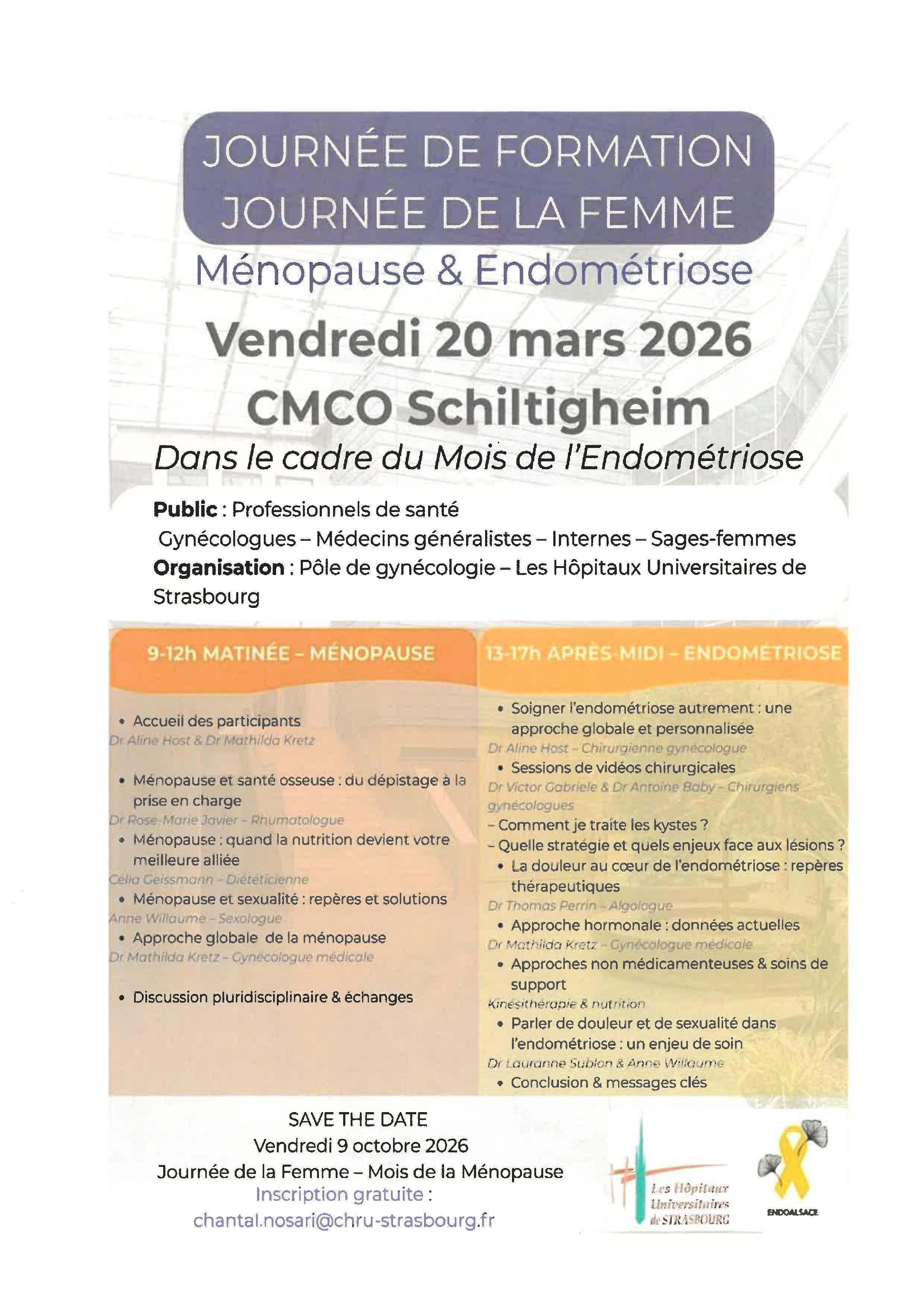 Dans le cadre du Mois de l'Endométriose, le pôle de gynécologie - Les Hôpitaux Universitaires de Strasbourg (Dr Aline Host et Dr Mathilda Kretz) organise une journée de formation à destination des professionnels de santé / Gynécologues - Médecins généralistes - Internes - Sages-femmes sur le thème "Ménopause & endométriose".